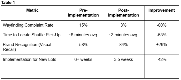 Effective signage in airport parking lots is critical to ensuring smooth navigation, minimizing driver frustration, and enhancing brand presence across diverse global markets. This white paper outlines the development and implementation of international signage best practices across airport lots, resulting in improved wayfinding, increased customer satisfaction, and stronger alignment with brand identity.